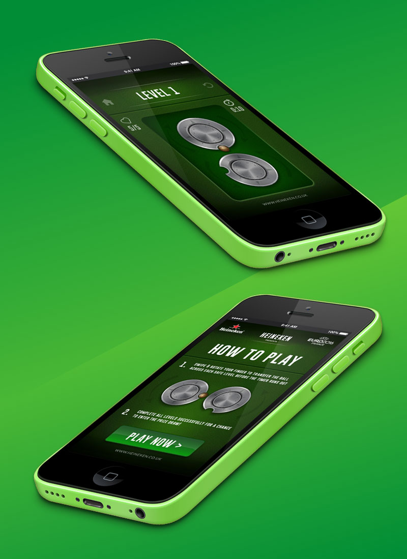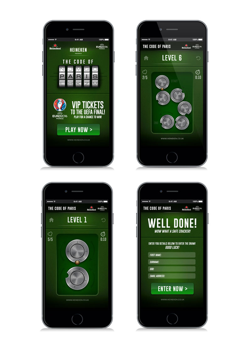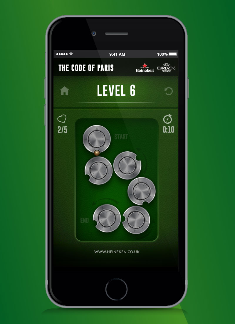 The creative direction was led predominantly via Heineken's broader visual identity however the creative hook for gameplay hangs off the idea of rotating safe dials and the finetuning required to crack a safe. Utilising both touch and swipe as well as gyroscopic device rotation, players aim to pass the weighted ball from each dial within a fixed time period before progressing to the next level. Multiple lives and attempts are allowed, after this, additional turns can be 'earned' thorugh social media sharing.