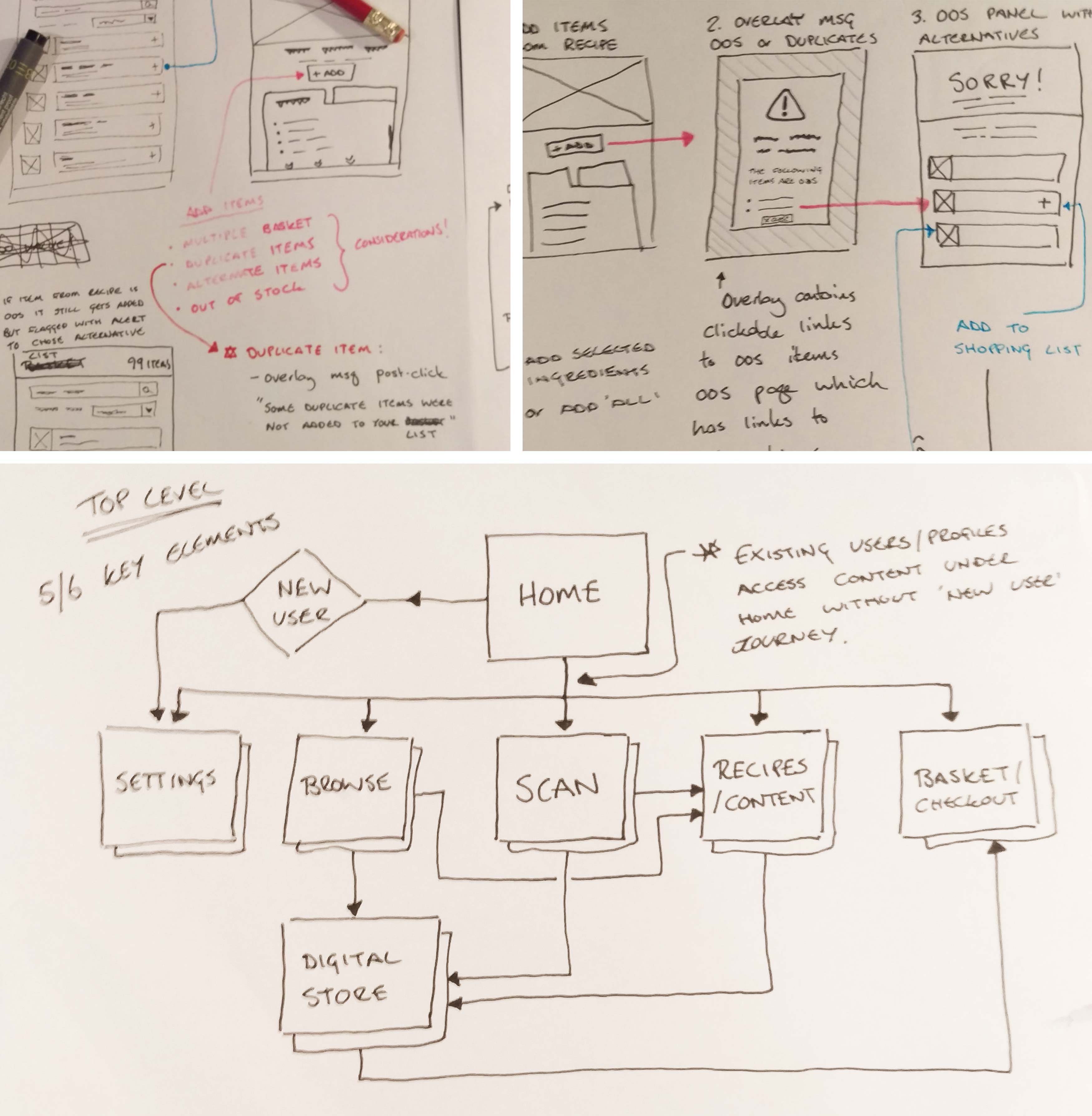 Initial wireframe and journey mapping sketches post audience research/questioning